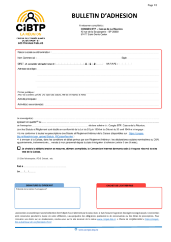 Bulletin d'adhésion à la Caisse Congés BTP Ile de La Réunion